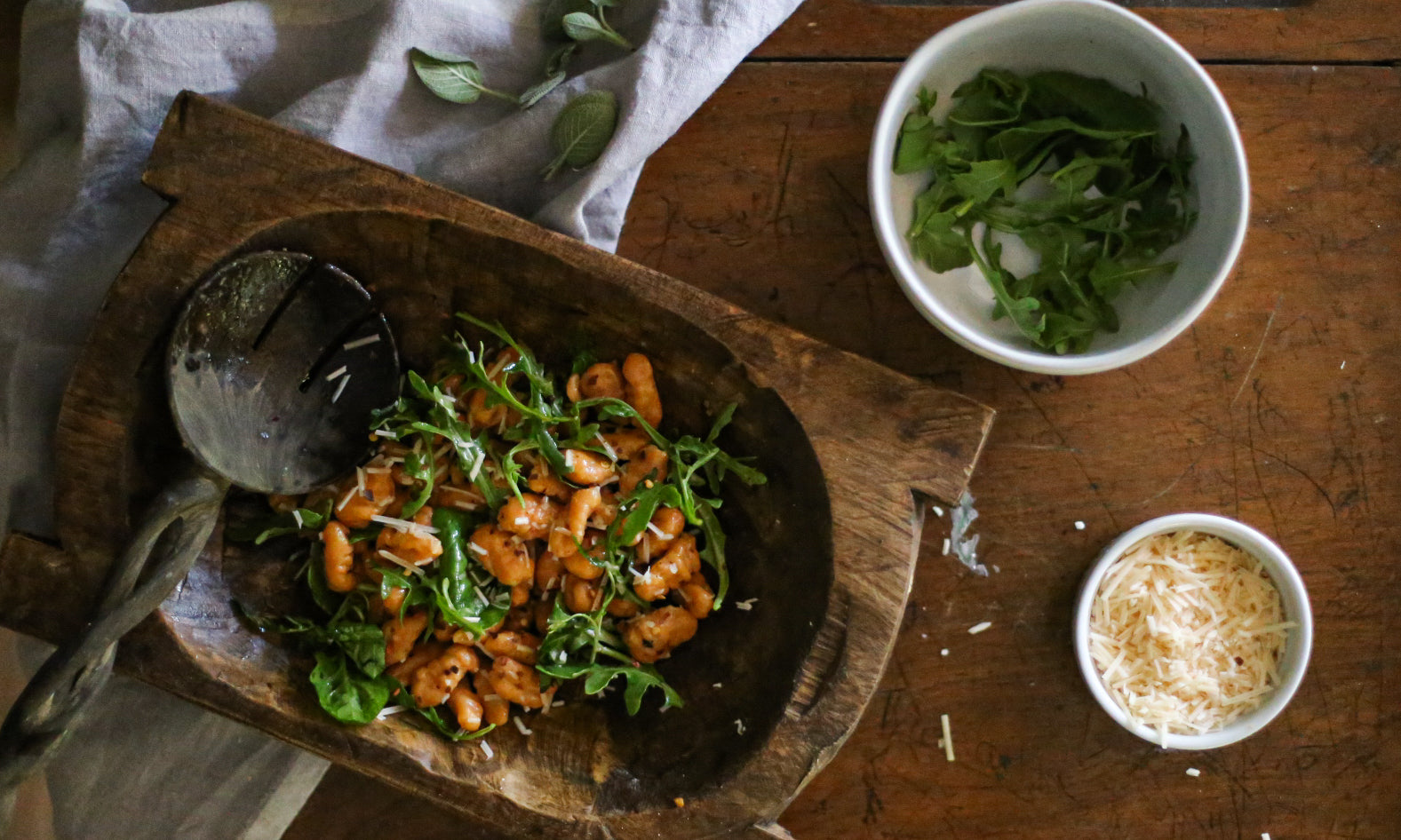 Sweet potatoes in gnocchi adds a unique and subtle sweetness. Its rich color adds visual appeal. Pairing sweet potatoes with the earthiness of sage and garlic, topped with a rich brown butter and sharp bite of arugula is a feast for the senses. If you like a subtle bite of heat, I recommend finishing off with a pinch of crushed red pepper flakes.Â