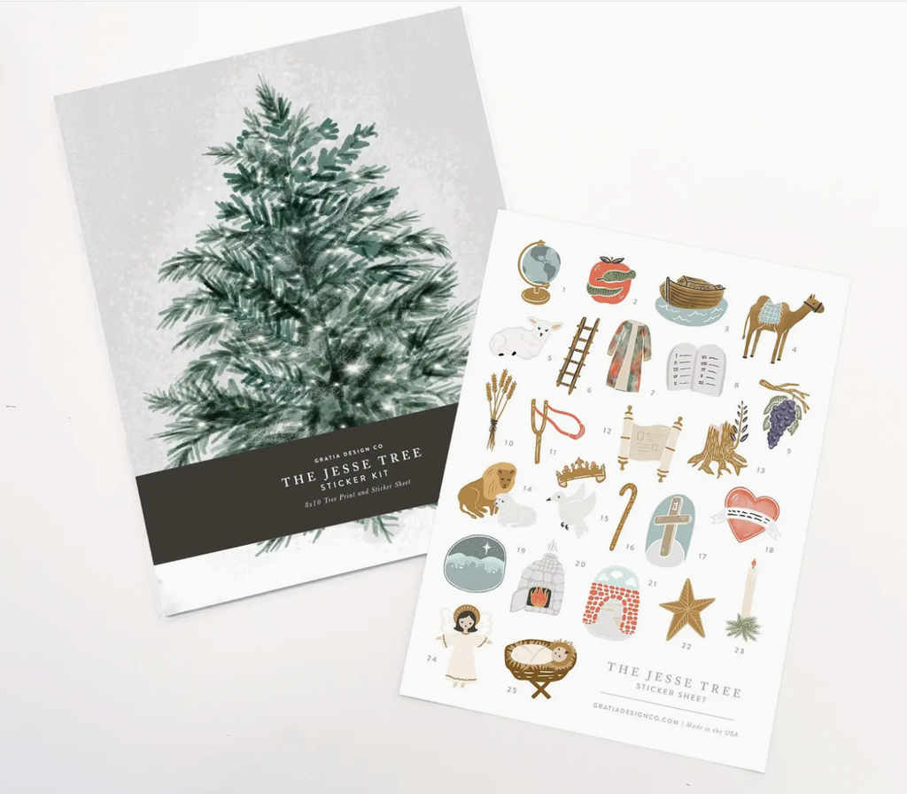 This special Jesse Tree Sticker Kit makes short work of advent. Every day from December 1st through 25th, place a sticker on the tree and watch the story unfold!Â
