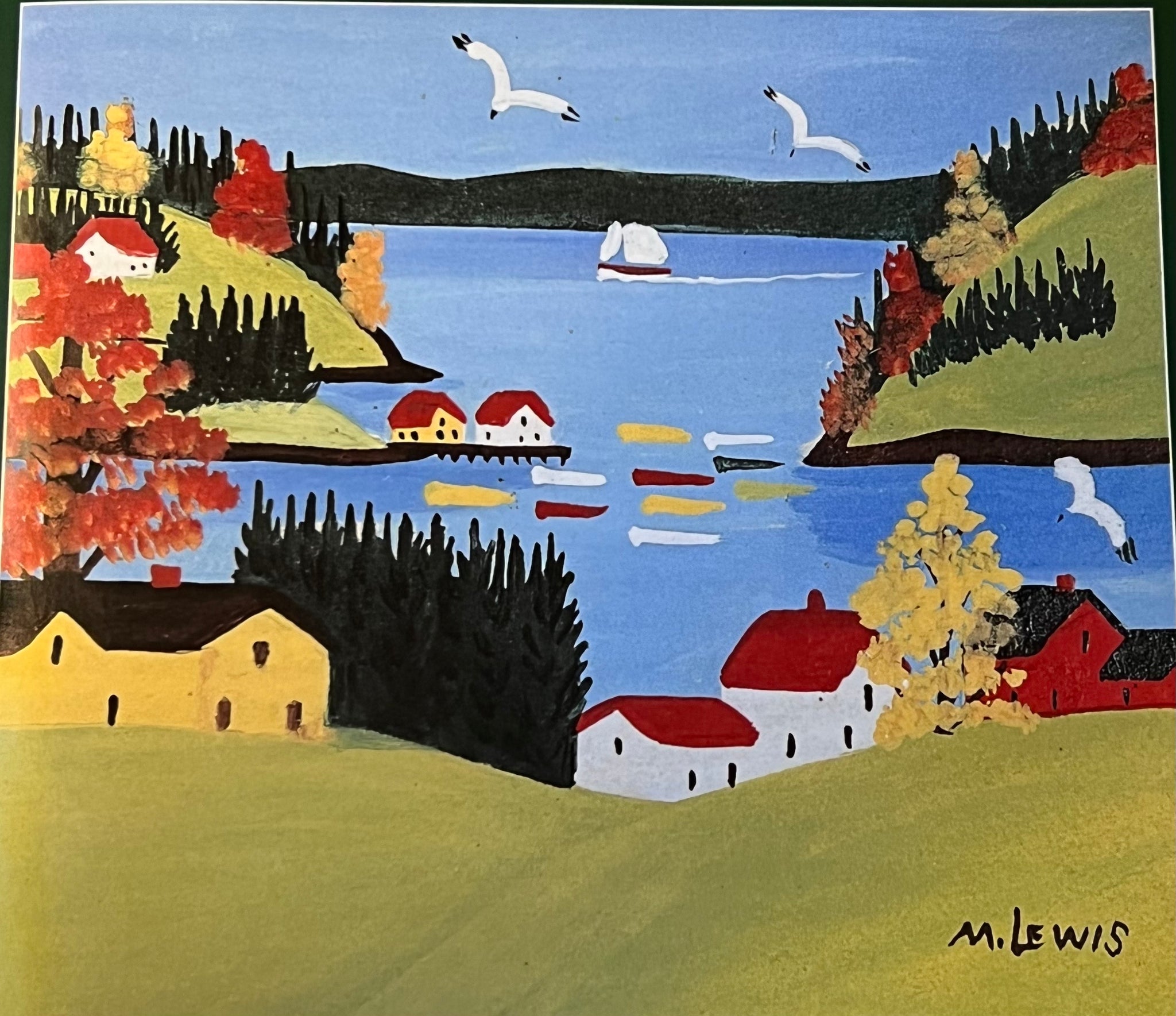Her paintings were soon talked about all over the United States. President Nixon wrote her a letter asking her to paint him two beautiful scenes. In her simple way, she had no idea of his importance, and wrote back that if he would send $10.00, she would send the pictures straight away. She painted and painted from morning until night filling orders and trying to make people happy with her painting. Other painters in Nova Scotia began to write her newsy little letters and many visitors asked for the quaint old Christmas Cards her mother had taught her to make long ago. Maud had become famous and was the pride of her homeland without ever leaving her little house.